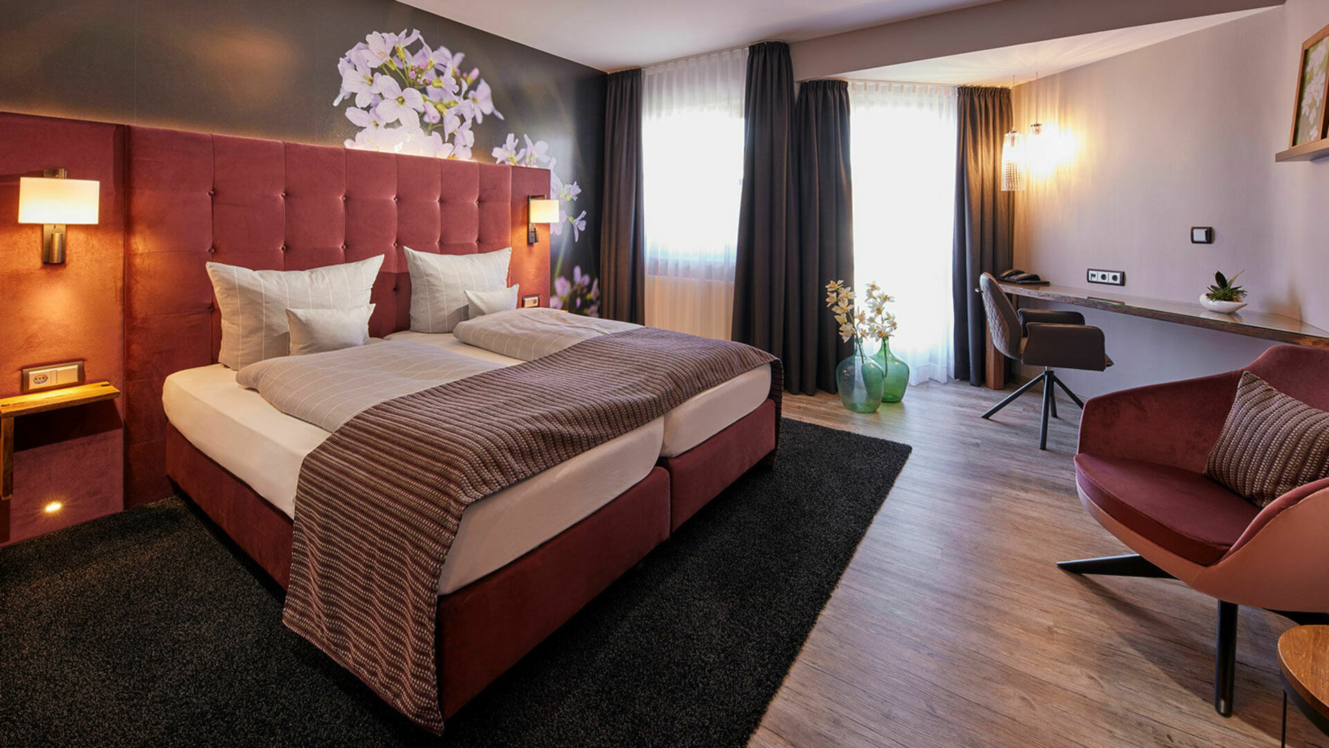 Die 19 stilvollen Zimmer verbinden modernes Design mit sauerländischer Wärme – Boxspringbetten, Regenduschen und knorrige Eichenbalken aus der alten Scheune schaffen Wohlfühl-Atmosphäre.